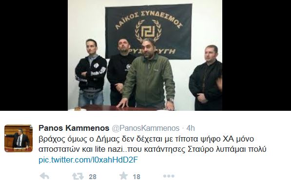 “Βράχος όμως ο Δήμας δεν δέχεται με τίποτα ψήφο Χρυσής Αυγής μόνο αποστατών και light nazi..που κατάντησες Σταύρο λυπάμαι πολύ” έγραψε ο πρόεδρος των ΑΝΕΛ στο twitter, αναφερόμενος στη θετική ψήφο των Χρυσοβαλάντη Αλεξόπουλου και Στάθη Μπούκουρα.