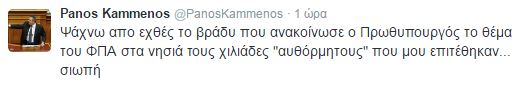 Ο υπουργός Εθνικής Άμυνας και πρόεδρος των Ανεξαρτήτων Ελλήνων Πάνος Καμμένος με αφορμή τη χθεσινή εξαγγελία του Πρωθυπουργού για αναστολή της αύξησης του ΦΠΑ στα νησιά που σηκώνουν το βάρος του προσφυγικού σχολίασε στον λογαριασμό του στο twitter: