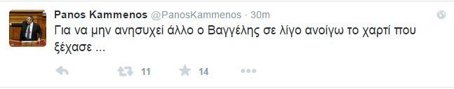 Συγκεκριμένα ο κ. Καμμένος, έγραψε: «Για να μην ανησυχεί άλλο ο Βαγγέλης σε λίγο ανοίγω το χαρτί που ξέχασε».