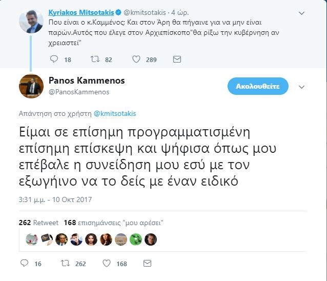 Στην ανάρτησή του, επίσης στο twitter, ο κ.Μητσοτάκης είχε γράψει: “Που είναι ο κ. Καμμένος; Και στον Άρη θα πήγαινε για να μην είναι παρών. Αυτός που έλεγε στον Αρχιεπίσκοπο “θα ρίξω την κυβέρνηση αν χρειαστεί””.
