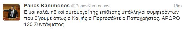 «Είμαι καλά, ηθικοί αυτουργοί της επίθεσης υπάλληλοι συμφερόντων που θίγουμε όπως ο Καψής ο Πορτοσάλτε ο Παπαχρήστος. ΑΡΘΡΟ 120 Συντάγματος», έγραψε ο Πάνος Καμμένος.