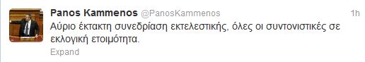 Συνεδριάζει εκτάκτως αύριο εκτελεστική επιτροπή των Ανεξάρτητων Ελλήνων, όπως ανακοίνωσε ο Πάνος Καμμένος στο Twitter του.