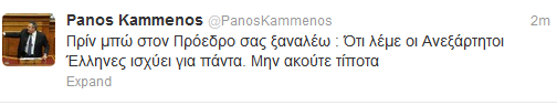 “Πρίν μπώ στον Πρόεδρο σας ξαναλέω : Ότι λέμε οι Ανεξάρτητοι Έλληνες ισχύει για πάντα. Μην ακούτε τίποτα”, έγραψε στο Twitter o πρόεδρος των Ανεξάρτητων Ελλήνων Πάνος Καμμένος, λίγο πριν την έναρξη της συνάντησης με τον πρόεδρο της Δημοκρατίας Κάρολο Παπούλια.