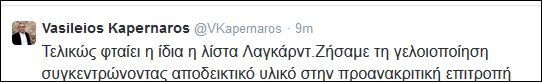 «Τελικώς φταίει η ίδια η λίστα Λαγκάρντ. Ζήσαμε τη γελοιοποίηση συγκεντρώνοντας αποδεικτικό υλικό στην προανακριτική επιτροπή», έγραψε ο κ. Καπερνάρος, ο οποίος ήταν μέλος της προανακριτικής επιτροπής και πρόσθεσε: