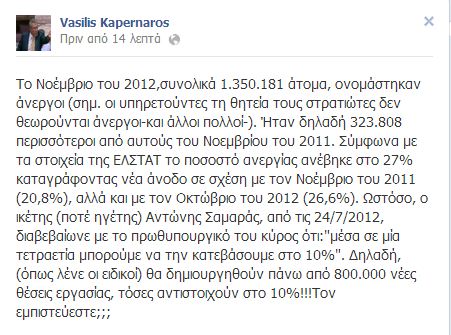 «Το Νοέμβριο του 2012,συνολικά 1.350.181 άτομα, ονομάστηκαν άνεργοι (σημ. οι υπηρετούντες τη θητεία τους στρατιώτες δεν θεωρούνται άνεργοι-και άλλοι πολλοί-). Ήταν δηλαδή 323.808 περισσότεροι από αυτούς του Νοεμβρίου του 2011. Σύμφωνα με τα στοιχεία της ΕΛΣΤΑΤ το ποσοστό ανεργίας ανέβηκε στο 27% καταγράφοντας νέα άνοδο σε σχέση με τον Νοέμβριο του 2011 (20,8%), αλλά και με τον Οκτώβριο του 2012 (26,6%). Ωστόσο, ο ικέτης (ποτέ ηγέτης) Αντώνης Σαμαράς, από τις 24/7/2012, διαβεβαίωνε με το πρωθυπουργικό του κύρος ότι: “μέσα σε μία τετραετία μπορούμε να την κατεβάσουμε στο 10%”. Δηλαδή, (όπως λένε οι ειδικοί) θα δημιουργηθούν πάνω από 800.000 νέες θέσεις εργασίας, τόσες αντιστοιχούν στο 10%!!!Τον εμπιστεύεστε;;;» γράφει ο κ. Καπερνάρος.