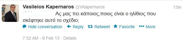 “Ας μας πει κάποιος, ποιος είναι ο ηλίθιος που σκέφτηκε αυτό το σχέδιο;”, έγραψε στο twitter ο Βασίλης Καπερνάρος.