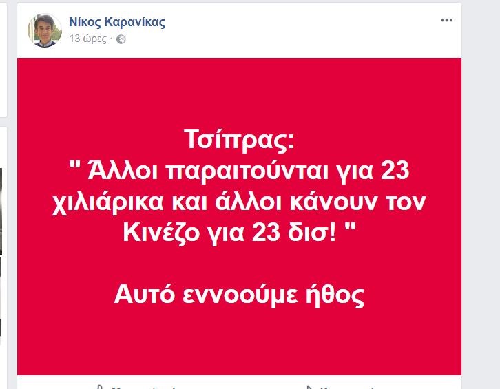 Την παραίτηση της Ράνιας Αντωνοπούλου αλλά και του Δημήτρη Παπαδημητρίου μετά την αποκάλυψη που αφορούσε στο επίδομα ενοικίου που λάμβανε η πρώην αναπληρώτρια υπουργός Εργασίας σχολίασε ο Νίκος Καρανίκας, με ανάρτησή του στο Facebook.Ο σύμβουλος Στρατηγικού Σχεδιασμού του πρωθυπουργικού γραφείου, χρησιμοποίησε μια φράση που είπε ο Αλέξης Τσίπρας χθες στην ομιλία του στο 10ο Περιφερειακό Συνέδριο, ότι δηλαδή «άλλοι παραιτούνται για 23.000 ευρώ και άλλοι κάνουν τον Κινέζο για 23 δισ. ευρώ» και σημείωσε : «Αυτό είναι ήθος».