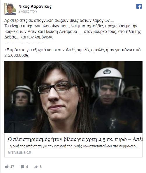 η Ζωή Κωνσταντοπούλου ήταν βίλας για χρέη 2,5 εκατ. ευρώ. Στην ανάρτησή του ο κ. Καρανίκας κάνει λόγο για «αριστεριστές σε απόγνωση» που «σώζουν βίλες αστών λαμόγιων»!