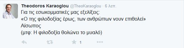 «Για τις εσωκομματικές μας εξελίξεις: “Ο της φιλοδοξίας έρως, των ανθρώπων νουν επιθολεί” Αίσωπος (μτφ Η φιλοδοξία θολώνει το μυαλό», έγραψε στο Twitter ο κ. Καράογλου, σχολιάζοντας με αυτόν τον τόπο τις τελευταίες εξελίξεις στο εσωτερικό του κόμματος της αξιωματικής αντιπολίτευσης.