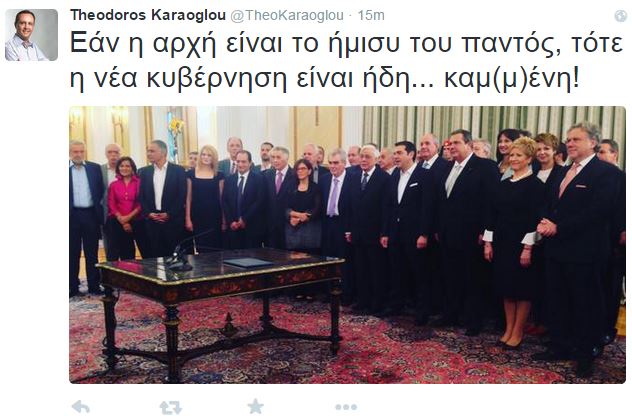 “Εάν η αρχή είναι το ήμισυ του παντός, τότε η νέα κυβέρνηση είναι ήδη… καμ(μ)ένη!” έγραψε.