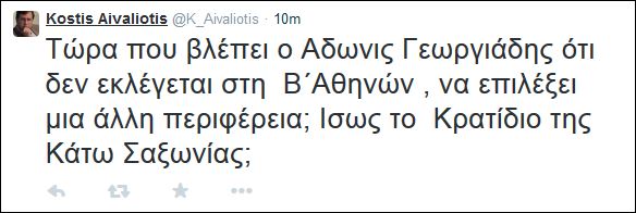 «Τώρα που βλέπει ο Αδωνις Γεωργιάδης ότι δεν εκλέγεται στη Β΄Αθηνών , να επιλέξει μια άλλη περιφέρεια; Ισως το Κρατίδιο της Κάτω Σαξωνίας;», αναφέρει στο «τιτίβισμά» του το στέλεχος του ΛΑΟΣ.