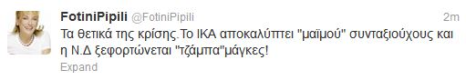 Η βουλευτής της Νέας Δημοκρατίας, Φωτεινή Πιπιλή σχολιάζει μέσω twitter, την διαγραφή του Νίκου Νικολόπουλου, από την Κ.Ο του κόμματος, κάνοντας λόγο για ”τζάμπα μάγκες που ξεφορτώνεται η Ν.Δ”.