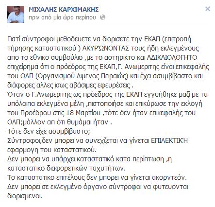 «Γιατί σύντροφοι μεθοδεύετε να διορίσετε την ΕΚΑΠ (Επιτροπή Τήρησης Καταστατικού) ακυρώνοντας τους ήδη εκλεγμένους απο το εθνικο συμβούλιο με το αστήρικτο και αδικαιολόγητικο επιχείρημα ότι ο πρόεδρος της ΕΚΑΠ, Γ. Ανωμεριτης είναι επικεφαλής του ΟΛΠ (Οργανισμού Λιμενος Πειραιώς) και έχει ασυμβίβαστο και διάφορες αλλες ισως αβάσιμες εφευρέσεις.