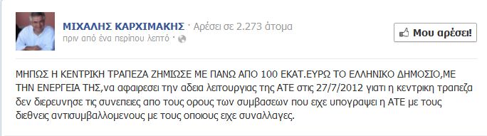 Βολές κατά της Τραπέζης της Ελλάδος εξαπέλυσε ο Μιχάλης Καρχιμάκης με ανάρτησή του στο Facebook, πριν από πολύ λίγο.