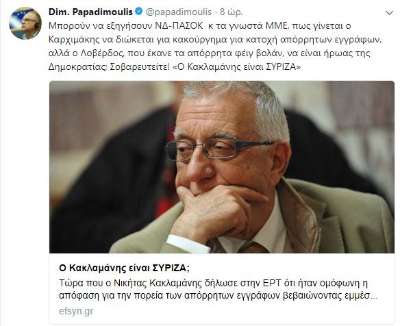 Να σημειώσουμε ότι νωρίτερα ο ευρωβουλευτής του ΣΥΡΙΖΑ και αντιπρόεδρος του Ευρωκοινοβουλίου, Δημήτρης Παπαδημούλης σχολιάζοντας την υπόθεση με τα απόρρητα έγγραφα του υπουργείου Άμυνας σχετικά με την πώληση πυρομαχικών στη Σαουδική Αραβία ανέφερε: «Μπορούν να εξηγήσουν ΝΔ-ΠΑΣΟΚ κ τα γνωστά ΜΜΕ, πως γίνεται ο Καρχιμάκης να διώκεται για κακούργημα για κατοχή απόρρητων εγγράφων, αλλά ο Λοβέρδος, που έκανε τα απόρρητα φέιγ βολάν, να είναι ήρωας της Δημοκρατίας; Σοβαρευτείτε! «Ο Κακλαμάνης είναι ΣΥΡΙΖΑ»