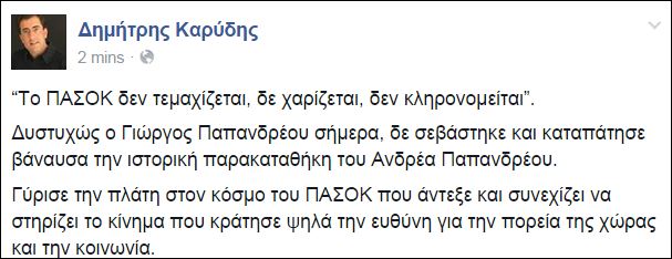 «Δυστυχώς ο Γιώργος Παπανδρέου σήμερα, δε σεβάστηκε και καταπάτησε βάναυσα την ιστορική παρακαταθήκη του Ανδρέα Παπανδρέου», έγραψε ο εκπρόσωπος Τύπου του ΠΑΣΟΚ, Δημήτρης Καρύδης, σχολιάζοντας την απόφαση του πρώην πρωθυπουργού να προχωρήσει στην ίδρυση νέου Κινήματος.