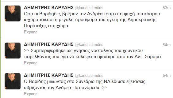 Συμπεριφέρθηκε ως γνήσιος νοσταλγός του χουντικού παρελθόντος του, για να καλύψει το φτύσιμο από τον Αντώνη Σαμαρά” έγραψε ο κ. Καρύδης στο Twitter.