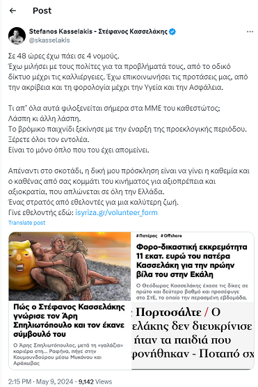 «Σε 48 ώρες έχω πάει σε 4 νομούς. Έχω μιλήσει με τους πολίτες για τα προβλήματά τους, από το οδικό δίκτυο μέχρι τις καλλιέργειες. Έχω επικοινωνήσει τις προτάσεις μας, από την ακρίβεια και τη φορολογία μέχρι την Υγεία και την Ασφάλεια» υπογραμμίζει, σε ανάρτησή του ο πρόεδρος του ΣΥΡΙΖΑ-ΠΣ, Στέφανος Κασσελάκης.