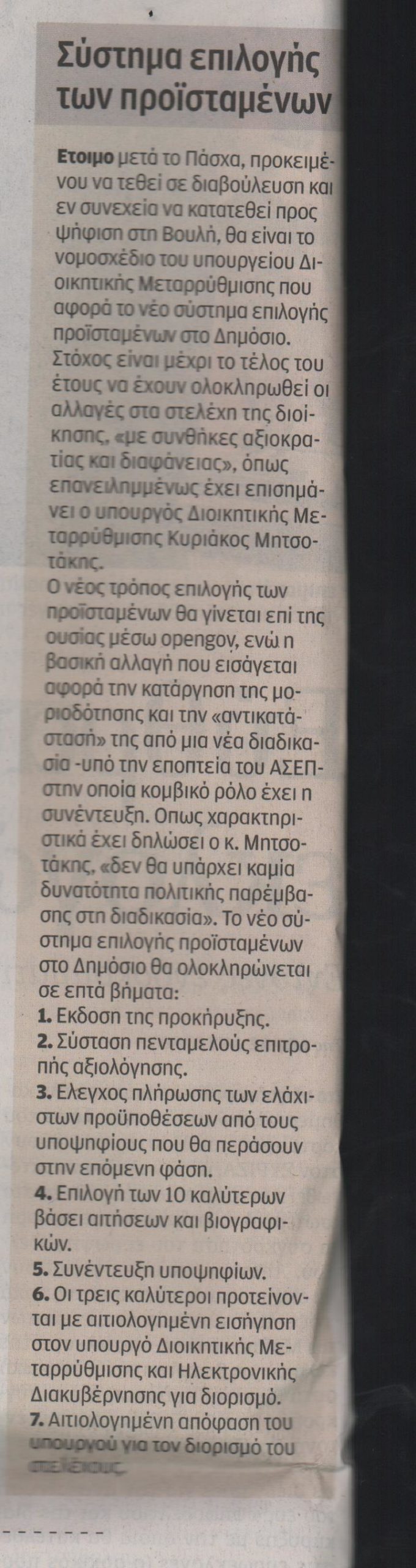 Στο υπουργείο Διοικητικής Μεταρρύθμισης εργάζονται πυρετωδώς, προκειμένου στο τέλος του μήνα, αμέσως μετά το Πάσχα, να τεθεί σε δημόσια διαβούλευση το νομοσχέδιο που θα αφορά την επιλογή στελεχών στο Δημόσιο, ενώ ήδη, ενόψει θέσπισης νέου μισθολογίου στο Δημόσιο, έχουν δοθεί οι πρώτες «κατευθυντήριες γραμμές» για την αξιολόγηση προσωπικού και οργανισμών.