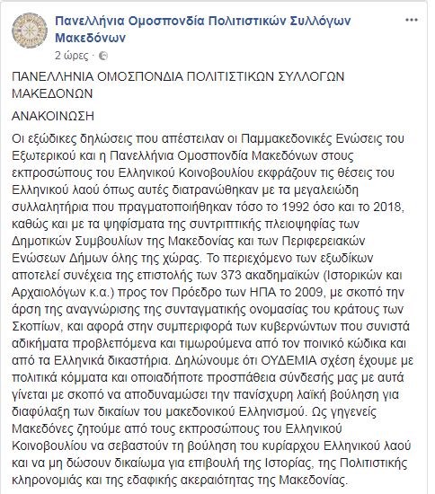 «Οι εξώδικες δηλώσεις που απέστειλαν οι Παμμακεδονικές Ενώσεις του Εξωτερικού και η Πανελλήνια Ομοσπονδία Μακεδόνων στους εκπροσώπους του Ελληνικού Κοινοβουλίου εκφράζουν τις θέσεις του Ελληνικού λαού όπως αυτές διατρανώθηκαν με τα μεγαλειώδη συλλαλητήρια που πραγματοποιήθηκαν τόσο το 1992 όσο και το 2018, καθώς και με τα ψηφίσματα της συντριπτικής πλειοψηφίας των Δημοτικών Συμβουλίων της Μακεδονίας και των Περιφερειακών Ενώσεων Δήμων όλης της χώρας. Το περιεχόμενο των εξωδίκων αποτελεί συνέχεια της επιστολής των 373 ακαδημαϊκών (Ιστορικών και Αρχαιολόγων κ.α.) προς τον Πρόεδρο των ΗΠΑ το 2009, με σκοπό την άρση της αναγνώρισης της συνταγματικής ονομασίας του κράτους των Σκοπίων, και αφορά στην συμπεριφορά των κυβερνώντων που συνιστά αδικήματα προβλεπόμενα και τιμωρούμενα από τον ποινικό κώδικα και από τα Ελληνικά δικαστήρια. Δηλώνουμε ότι ΟΥΔΕΜΙΑ σχέση έχουμε με πολιτικά κόμματα και οποιαδήποτε προσπάθεια σύνδεσής μας με αυτά γίνεται με σκοπό να αποδυναμώσει την πανίσχυρη λαϊκή βούληση για διαφύλαξη των δικαίων του μακεδονικού Ελληνισμού. Ως γηγενείς Μακεδόνες ζητούμε από τους εκπροσώπους του Ελληνικού Κοινοβουλίου να σεβαστούν τη βούληση του κυρίαρχου Ελληνικού λαού και να μη δώσουν δικαίωμα για επιβουλή της Ιστορίας, της Πολιτιστικής κληρονομιάς και της εδαφικής ακεραιότητας της Μακεδονίας».