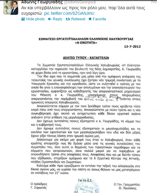 Φυσικά ο ‘Αδωνις Γεωργιάδης, δεν άφησε ασχολίαστη την ανακοίνωση του Σωματείου Εργατοϋπαλλήλων Ελληνικής Χαλυβουργίας.”Αν και υπερβάλλουν ως προς τον ρόλο μου, παρ’ όλα αυτά τους ευχαριστώ”, γράφει ο Άδωνις Γεωργιάδης.