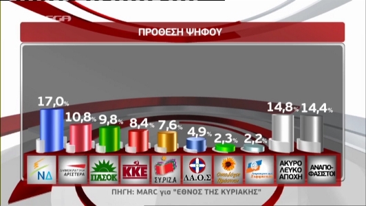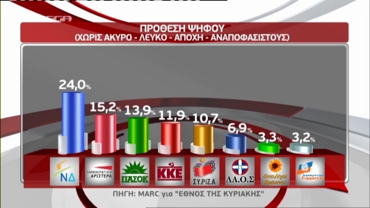 Στην πρόθεση ψήφου επί των έγκυρων, η ΝΔ συγκεντρώνει το 24% έναντι 11,5% που συγκεντρώνει η Δημοκρατική Αριστερά. Στην τρίτη θέση και με ποσοστό 11% βρίσκονται το ΠΑΣΟΚ και το ΚΚΕ, ενώ ακολουθεί ο ΣΥΡΙΖΑ με 8%, ο ΛΑΟΣ με 5%, οι Οικολόγοι Πράσινοι και η Χρυσή Αυγή με 3,5%, ενώ η Δημοκρατική Συμμαχία φτάνει το 3%.