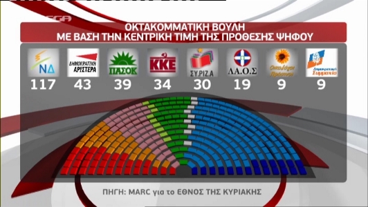 Με βάση τα συγκεκριμένα αποτελέσματα η ΝΔ θα είχε 117 έδρες στη Βουλή, η Δημοκρατική Αριστερά 43, το ΠΑΣΟΚ 39, το ΚΚΕ 34, ο ΣΥΡΙΖΑ 30, ο ΛΑΟΣ 19 και από 9 έδρες οι Οικολόγοι Πράσινοι και η Δημοκρατική Συμμαχία.