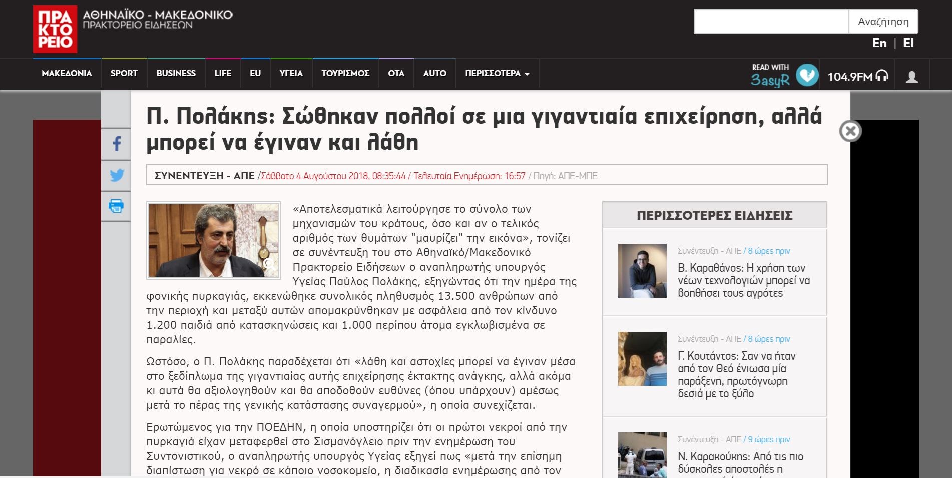 «Επειδή βρέθηκα από τις πρώτες στιγμές μέσα στις εξελίξεις και έζησα από κοντά όλη εκείνη τη νύχτα, είμαι σε θέση να γνωρίζω ότι το σύνολο των μηχανισμών του κράτους, από τα ένστολα τμήματα (Αστυνομία, Πυροσβεστική, Λιμενικό, Ένοπλες Δυνάμεις κ.λπ.), μέχρι την Περιφέρεια, τους δήμους, την Πολιτική Προστασία, τις υγειονομικές δομές κ.λπ., ανταποκρίθηκαν θετικά και λειτούργησαν αποτελεσματικά, όσο και αν ο τελικός αριθμός θυμάτων «θολώνει» την εικόνα. Πρέπει να υπολογίσετε ότι εκκενώθηκε συνολικός πληθυσμός περίπου 13.500 ανθρώπων από την περιοχή και μεταξύ αυτών απομακρύνθηκαν με ασφάλεια από τον κίνδυνο 1.200 παιδιά από κατασκηνώσεις και 1.000 περίπου άτομα εγκλωβισμένα σε παραλίες. Λάθη και αστοχίες μπορεί να έγιναν μέσα στο ξεδίπλωμα της γιγαντιαίας αυτής επιχείρησης έκτακτης ανάγκης, αλλά ακόμα κι αυτά θα αξιολογηθούν και θα αποδοθούν ευθύνες (όπου υπάρχουν) αμέσως μετά το πέρας της γενικής κατάστασης συναγερμού, ετοιμότητας και αντιμετώπισης των συνεπειών, στην οποία είμαστε ακόμα» ανέφερε χαρακτηριστικά ο κ. Πολάκης, απαντώντας σε σχετική ερώτηση.