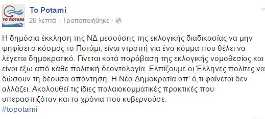 “Η δημόσια έκκληση της ΝΔ μεσούσης της εκλογικής διαδικασίας να μην ψηφίσει ο κόσμος το Ποτάμι, είναι ντροπή για ένα κόμμα που θέλει να λέγεται δημοκρατικό. Γίνεται κατά παράβαση της εκλογικής νομοθεσίας και είναι έξω από κάθε πολιτική δεοντολογία. Ελπίζουμε οι Έλληνες πολίτες να δώσουν τη δέουσα απάντηση. Η Νέα Δημοκρατία απ’ ό,τι φαίνεται δεν αλλάζει. Ακολουθεί τις ίδιες παλαιοκομματικές πρακτικές που υπερασπιζόταν και τα χρόνια που κυβερνούσε”, ήταν η ανάρτηση του Ποταμιού στη σελίδα του στο Facebook.