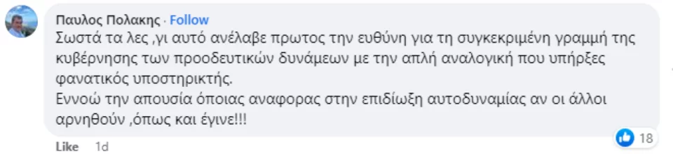 Ο Παύλος Πολάκης έσπευσε να σχολιάσει την ανάρτηση Μπίστη, με μια δόση ειρωνείας.  «Σωστά τα λες, γι’ αυτό ανέλαβε πρώτος την ευθύνη για τη συγκεκριμένη γραμμή της κυβέρνησης των προοδευτικών δυνάμεων με την απλή αναλογική που υπήρξες φανατικός υποστηρικτής. Εννοώ την απουσία όποιας αναφοράς στην επιδίωξη αυτοδυναμίας αν οι άλλοι αρνηθούν, όπως και έγινε!!!» ήταν το σχόλιο του Παύλου Πολάκη κάτω από την ανάρτηση του Νίκου Μπίστη.