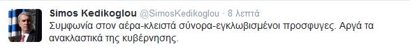 Ο κ.Κεδίκογλου αναφέρει στο Twitter: «Συμφωνία στον αέρα, κλειστά σύνορα, εγκλωβισμένοι πρόσφυγες. Αργά τα ανακλαστικά της κυβέρνησης».