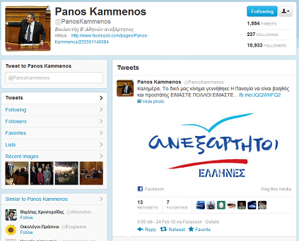 Όχι μόνο μέσω του facebook, αλλά και μέσω του twitter ανακοινώθηκαν οι “Ανεξάρτητοι Έλληνες” του Πάνου Καμμένου. ΔΕΙΤΕ ΤΗ ΦΩΤΟΓΡΑΦΙΑ: