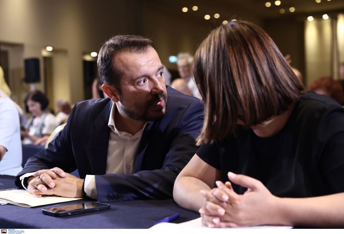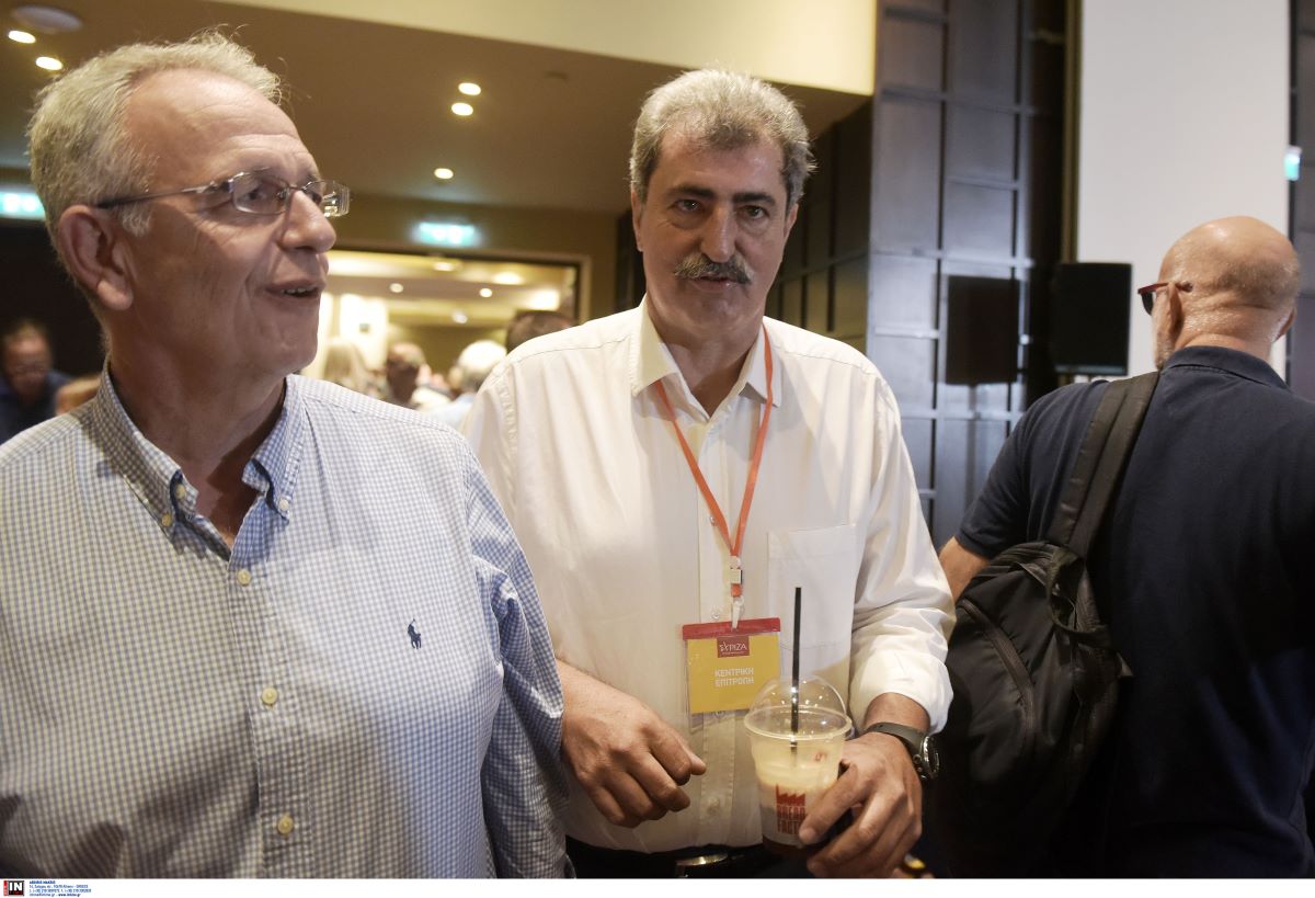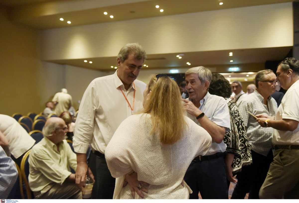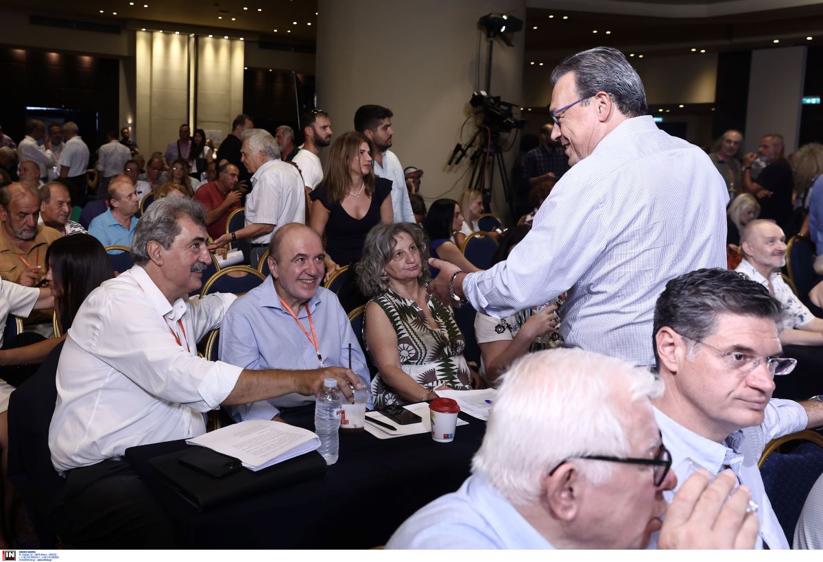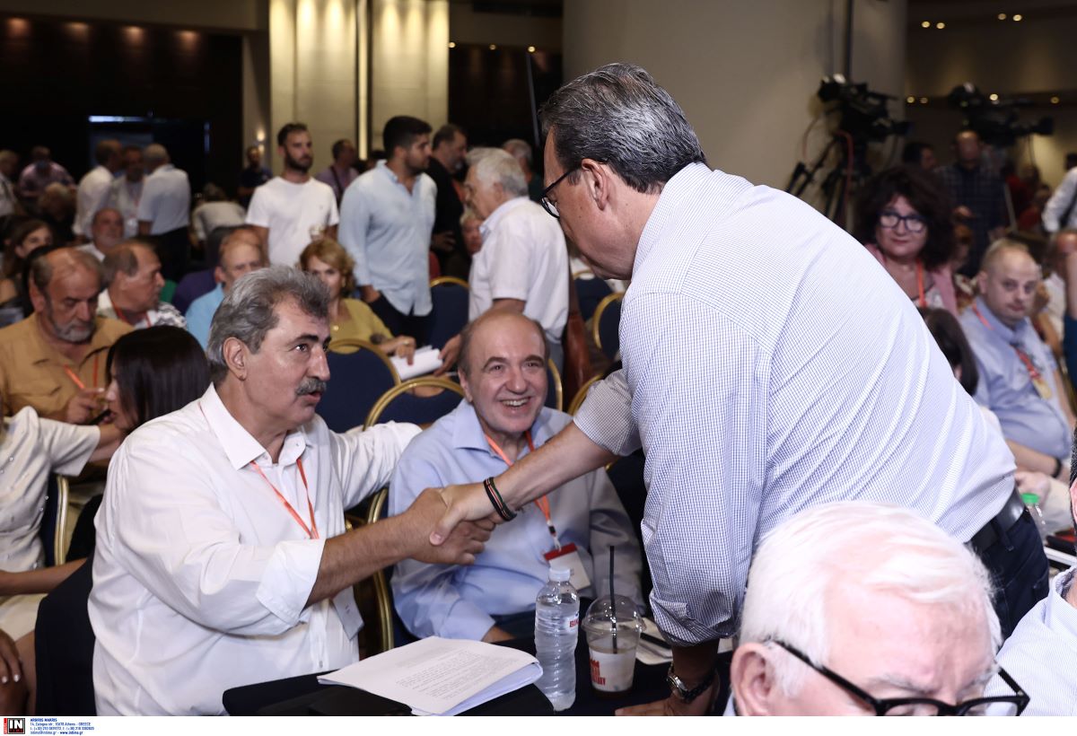 Ο Σωκράτης Φάμελλος χαμογελαστός συνομιλεί με τον Παύλο Πολάκη. Οι δύο άνδρες χαιρετήθηκαν και δια χειραψίας.