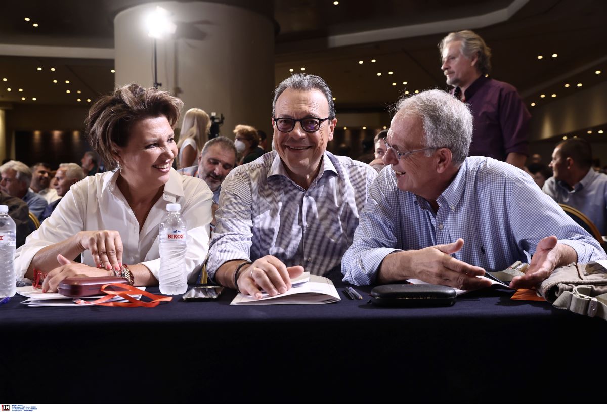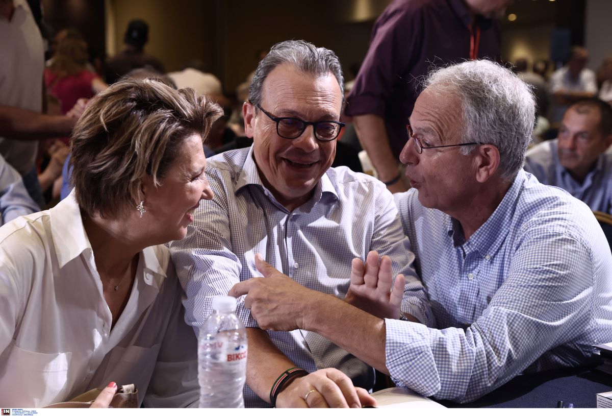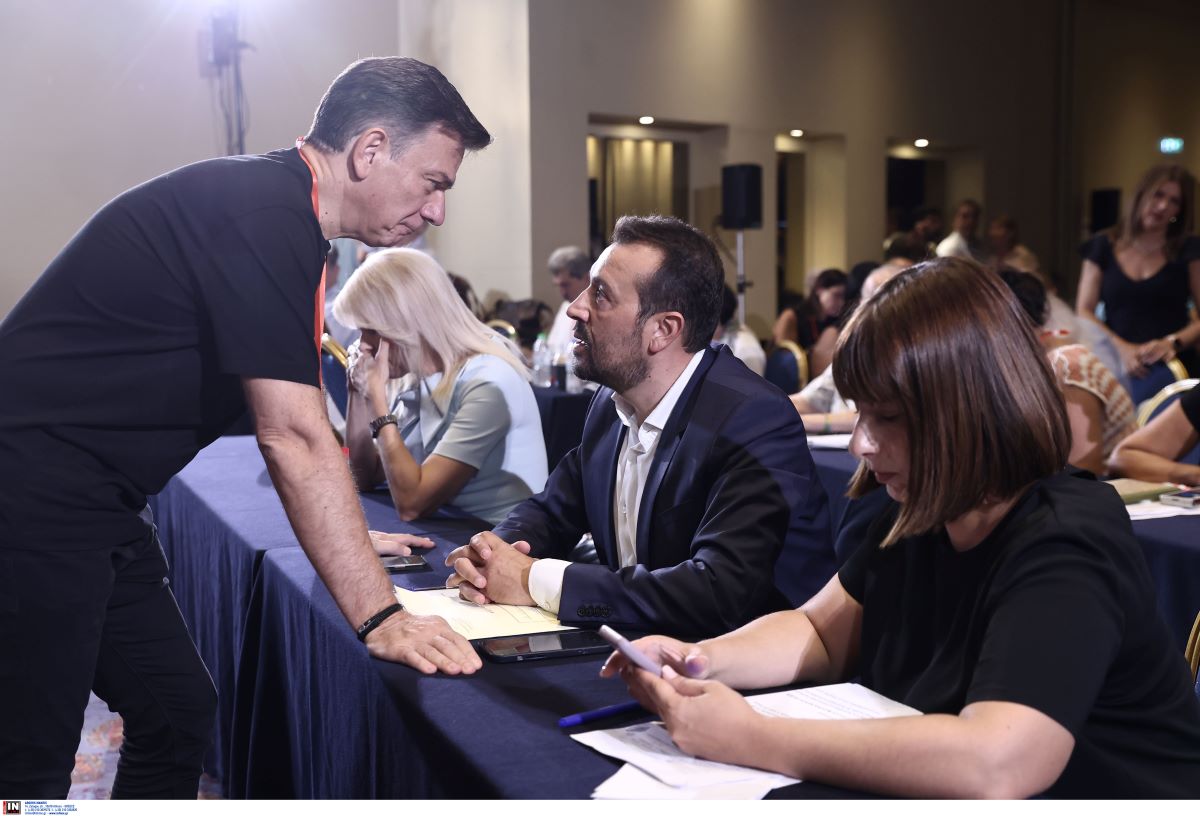 Ένα από τα «πηγαδάκια» πριν την έναρξη της ομιλίας του Στέφανου Κασσελάκη ήταν αυτό του Σωκράτη Φάμελλου, της Όλγας Γεροβασίλη και του Παναγιώτη Ρήγα.