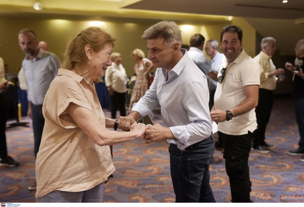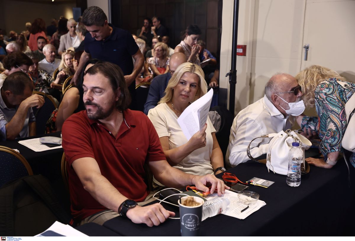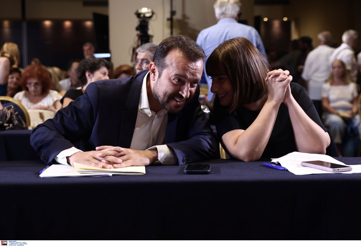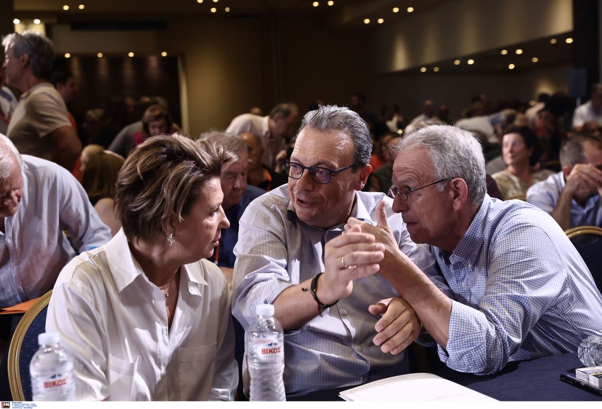 Ένα από τα «πηγαδάκια» πριν την έναρξη της ομιλίας του Στέφανου Κασσελάκη ήταν αυτό του Σωκράτη Φάμελλου, της Όλγας Γεροβασίλη και του Παναγιώτη Ρήγα.