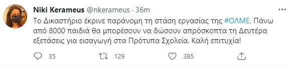 «Το Δικαστήριο έκρινε παράνομη τη στάση εργασίας της ΟΛΜΕ» ανέφερε σε ανάρτησή της στο Twitter η υπουργός Παιδείας Νίκη Κεραμέως λίγο μετά την απόφαση του Μονομελούς Πρωτοδικείου Αθηνών.