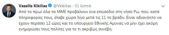 «Είναι αδιανόητο να έχουν περάσει 12 ώρες και το υπουργείο Εθνικής Άμυνας να μην έχει ακόμη ενημερώσει τους πολίτες για το τι ακριβώς συνέβη» τονίζει σε ανάρτησή του στο twitter ο τομεάρχης Άμυνας της ΝΔ, Βασίλης Κικίλιας, σχετικά με το επεισόδιο στη νήσο Ρω.