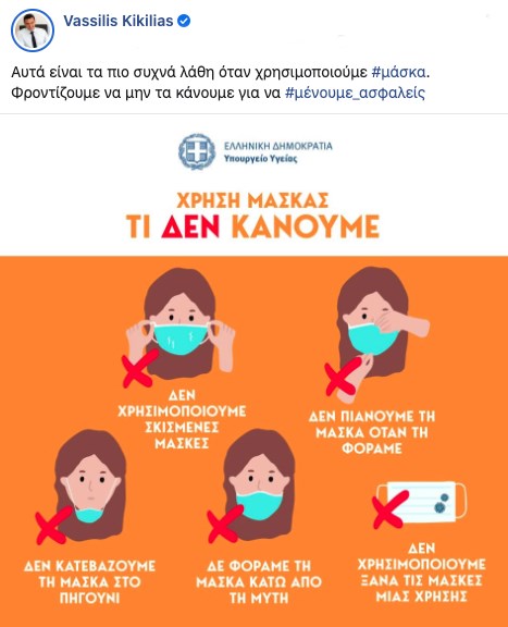Το υπουργείο Υγείας, και ο υπουργός Βασίλης Κικίλιας, δημοσίευσαν ένα σχεδιάγραμμα στο οποίο απεικονίζονται οι πέντε τρόποι με τους οποίους δεν πρέπει να χρησιμοποιούνται οι μάσκες.«Αυτά είναι τα πιο συχνά λάθη όταν χρησιμοποιούμε #μάσκα. Φροντίζουμε να μην τα κάνουμε για να #μένουμε_ασφαλείς», αναφέρει σε ανάρτησή του στο Twitter ο κ. Κικίλιας ανεβάζοντας τη σχετική φωτογραφία.