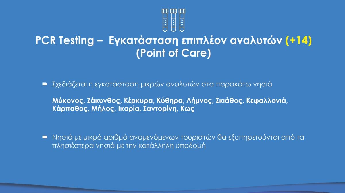 “Υπάρχει ανάγκη για ανάπτυξη ταχέων μοριακών εξετάσεων, γι’ αυτό βάζουμε μικρούς αναλυτές στα νησιά”, σημείωσε ο Βασίλης Κικίλιας και ανακοίνωσε ότι «επιπλέον μοριακοί αναλυτές (PCR testing) θα εγκατασταθούν και σε άλλα νησιά”.