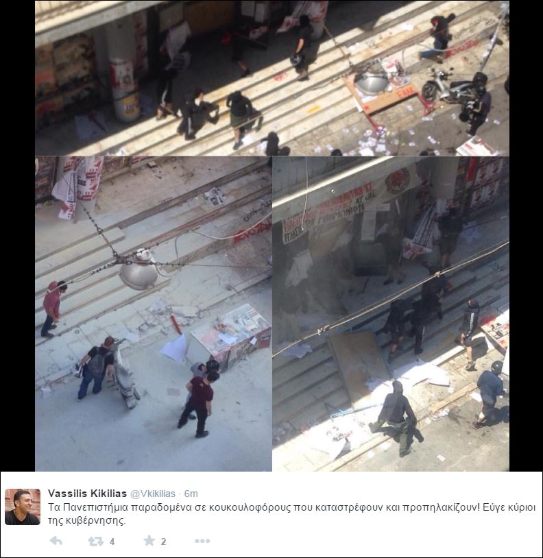 Τα Πανεπιστήμια παραδομένα σε κουκουλοφόρους που καταστρέφουν και προπηλακίζουν! Εύγε κύριοι της κυβέρνησης, έγραψε στο Twitter ο βουλευτής της ΝΔ και πρώην υπουργός Προστασίας του Πολίτη Βασίλης Κικίλιας, σχολιάζοντας τα όσα συνέβησαν σήμερα στο ΑΠΘ, το Χημείο και το Οικονομικό Πανεπιστήμιο, με φόντο τις φοιτητικές εκλογές.