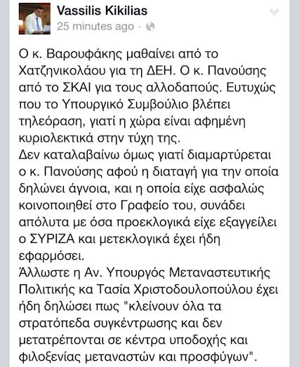 “Ο κ. Βαρουφάκης μαθαίνει από το Χατζηνικολάου για τη ΔΕΗ. O κ. Πανούσης από το ΣΚΑΙ για τους αλλοδαπούς. Ευτυχώς που το Υπουργικό Συμβούλιο βλέπει τηλεόραση, γιατί η χώρα είναι αφημένη κυριολεκτικά στην τύχη της. Δεν καταλαβαίνω όμως γιατί διαμαρτύρεται ο κ. Πανούσης αφού η διαταγή για την οποία δηλώνει άγνοια, και η οποία είχε ασφαλώς κοινοποιηθεί στο Γραφείο του, συνάδει απόλυτα με όσα προεκλογικά είχε εξαγγείλει ο ΣΥΡΙΖΑ και μετεκλογικά έχει ήδη εφαρμόσει.
