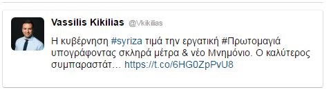 Επίθεση στην κυβέρνηση εξαπέλυσε μέσω ανάρτησης στον προσωπικό του λογαριασμό στο Twitter ο εκπρόσωπος Τύπου της αξιωματικής αντιπολίτευσης, Βασίλης Κίκιλιας.«Η κυβέρνηση ΣΥΡΙΖΑ τιμά την εργατική Πρωτομαγιά υπογράφοντας σκληρά μέτρα και νέο Μνημόνιο. Ο καλύτερος συμπαραστάτης όλων των εποχών», έγραψε χαρακτηριστικά στην ανάρτηση του ο εκπρόσωπος Τύπου της Νέας Δημοκρατίας απαντώντας σε σχόλιο του κυβερνητικού εκπροσώπου Δημήτρη Τζανακόπουλου.Δείτε την ανάρτηση του Βασίλη Κικίλια: