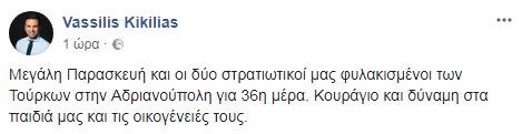 «Μεγάλη Παρασκευή και οι δύο στρατιωτικοί μας φυλακισμένοι των Τούρκων στην Ανδριανούπολη για 36η μέρα. Κουράγιο και δύναμη στα παιδιά μας και τις οικογένειές τους» έγραψε ο Βασίλης Κικίλιας.
