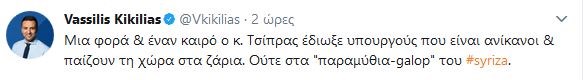 Με σχόλιο στο Twitter ο εκπρόσωπος Τύπου της ΝΔ Βασίλης Κικίλιας επαναφέρει το αίτημα του κόμματός τους για παραίτηση των κκ Κουρουμπλή και Καμμένου, εξαπολύοντας επίθεση κατά του Πρωθυπουργού.