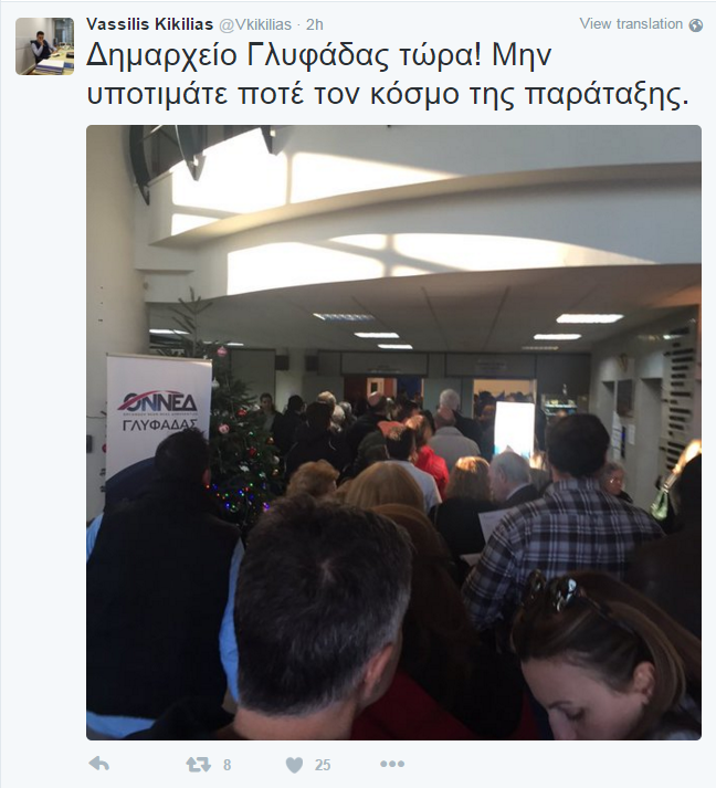 Φωτογραφία από το δημαρχείο της Γλυφάδας, όπου είναι συγκεντρωμένος ο κόσμος για να ψηφίσει τον νέο Πρόεδρο της Νέας Δημοκρατίας, ανέβασε στον προσωπικό του λογαριασμό στο Twitter ο βουλευτής της ΝΔ Βασίλης Κικίλιας και έγραψε: «Δημαρχείο Γλυφάδας τώρα. Μην υποτιμάτε ποτέ τον κόσμο της παράταξης»