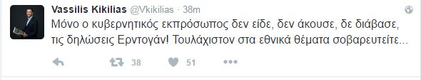 Με ανάρτησή του στον προσωπικό του λογαριασμό στο twiiter ο εκπρόσωπος Τύπου της ΝΔ Βασίλης Κικίλιας απάντησε στα όσα είπε ο κυβερνητικός εκπρόσωπος Δημήτρης Τζανακόπουλος για τις δηλώσεις Ερντογάν.