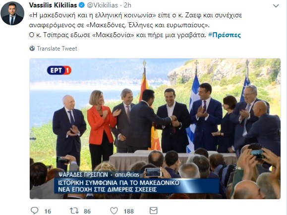 Ο τομεάρχης Άμυνας και βουλευτής της ΝΔ, Βασίλης Κικίλιας, σχολίασε στον προσωπικό του λογαριασμό στο twitter, την υπογραφή της συμφωνίας για το Σκοπιανό στις Πρέσπες.