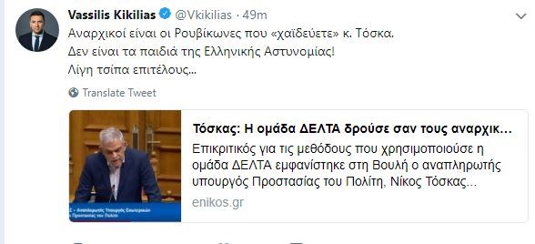 «Αναρχικοί είναι οι Ρουβίκωνες που «χαϊδεύετε» κ. Τόσκα. Δεν είναι τα παιδιά της Ελληνικής Αστυνομίας! Λίγη τσίπα επιτέλους…» έγραψε στο Twitter ο Τομεάρχης ‘Αμυνας της Νέας Δημοκρατίας.