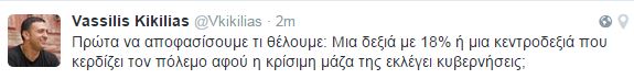 “Πρώτα να αποφασίσουμε τι θέλουμε: Μια δεξιά με 18% ή μια κεντροδεξιά που κερδίζει τον πόλεμο αφού η κρίσιμη μάζα της εκλέγει κυβερνήσεις;” έγραψε στο λογαριασμό του στο Twitter ο βουλευτής της ΝΔ και πρώην υπουργός Δημόσιας Τάξης, Βασίλης Κικίλιας.