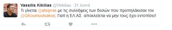 Ερώτηση στον προσωπικό λογαριασμό του Αλέξη Τσίπρα στο Twitter απηύθυνε ο βουλευτής της ΝΔ, Βασίλης Κικίλιας, αναφορικά με την επίθεση που δέχθηκε χθες ο Γιώργος Κουμουτσάκος.